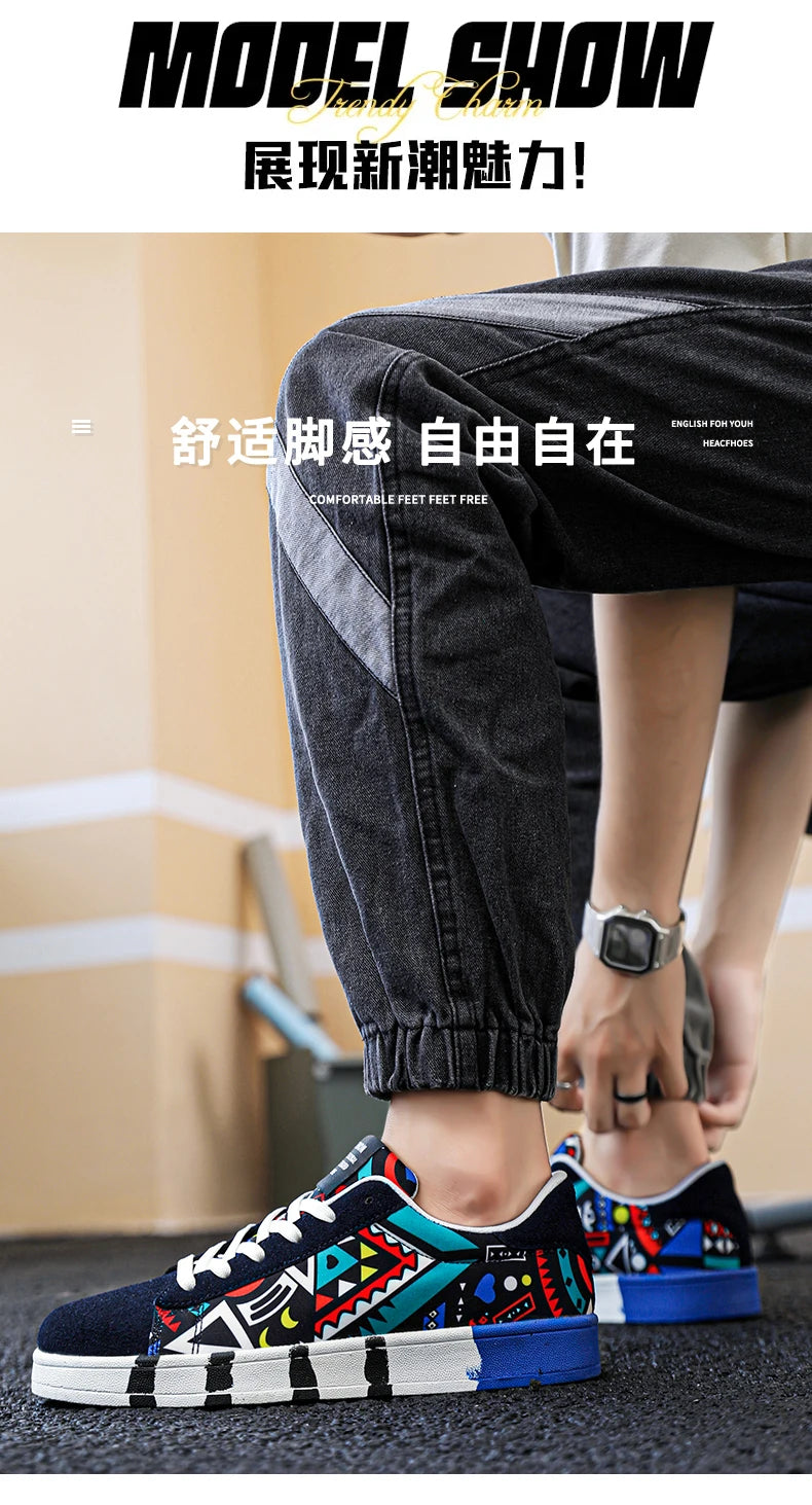 YRZL Men's Sports Canvas Sneakers - Geometric Graffiti Print Skate Shoes
